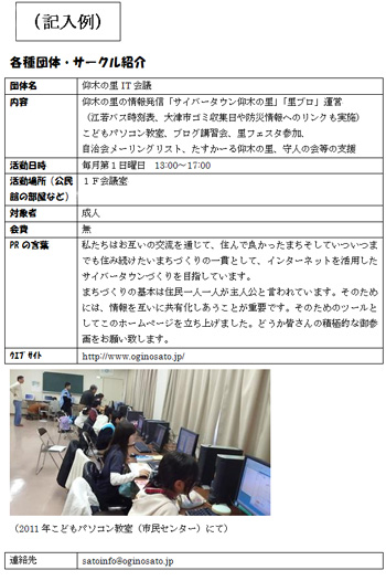 それぞれ充実した活動をされていると思いますが、 メンバ募集などにお困りではありませんか? 最近では地域活動や趣味のサークルについて、 ホームページから検索したり情報収集される方が増えております。 そこで、仰木の里IT会議では、 仰木の里学区、仰木の里東学区で活動されている皆さまの広報を支援すべく、 「仰木の里サイバータウンホームページ」内に、 仰木の里/里東学区内の各種団体・サークルのご紹介ページを 加えることにいたしました。 ご応募頂きました先着順に 当サイト内にUPさせて頂きます。 記入例として我々仰木の里IT会議の紹介させて頂きますので この項目に沿った内容で頂ければ幸いです。 尚、この紹介コンテンツは、 今後仰木の里/里東学区内の病院・店舗の紹介と ジャンルを広げていきたいと考えています。 | |||||||