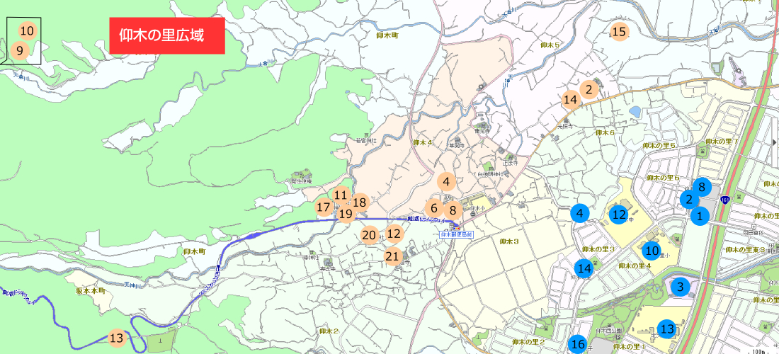 仰木の里学区の名所、史跡、遺跡、公園、学校、公共施設をご紹介します。