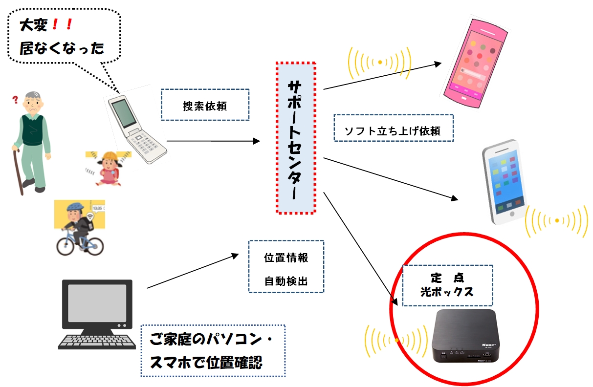 ビーコンを所持したひとり歩き者などが発信する電波を、定点(光ボックス)と定人(電波検知アプリをインストールしたスマートフォンを所有する住民協力者)の網目状の捜索網により迅速に発見・確保するシステムです。